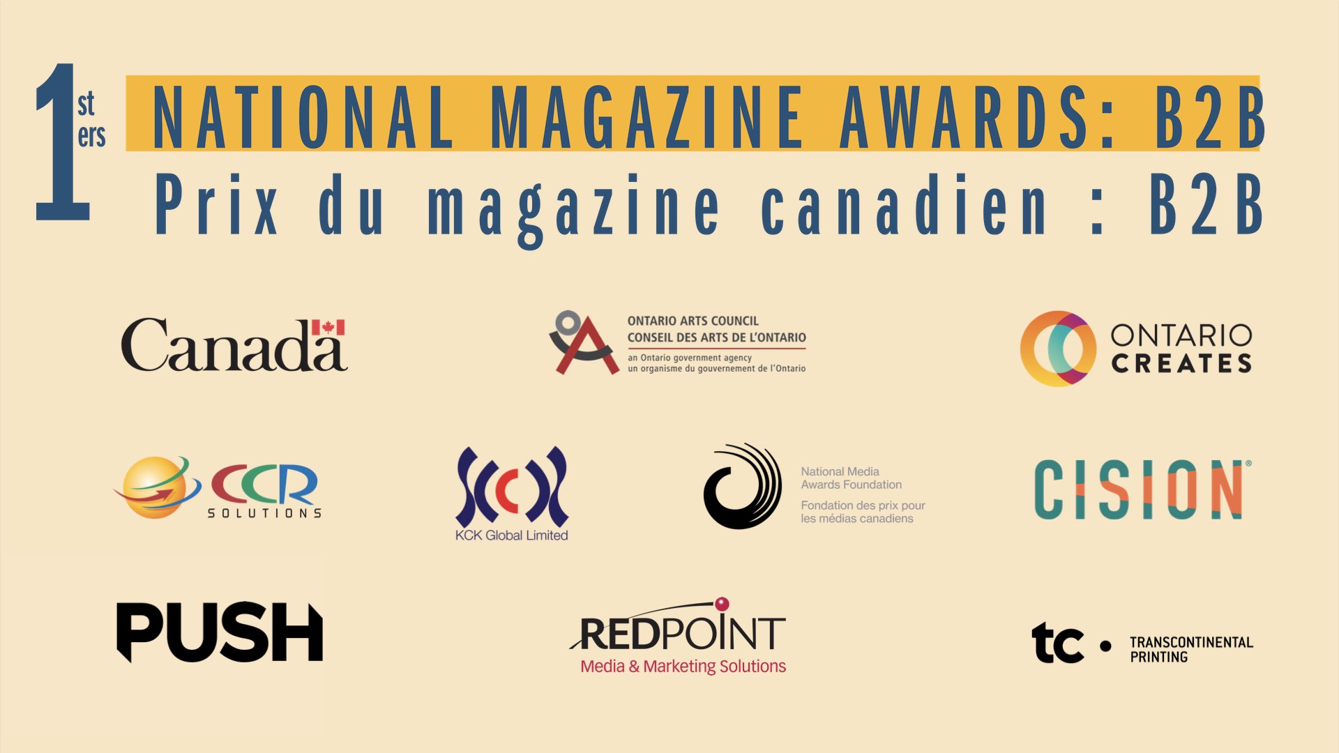 La Fondation tient à souligner le soutien du gouvernement du Canada, du Conseil des arts de l’Ontario, de Ontario Créatif et de KCK Global. La Fondation remercie également ses partenaires : CCR Solutions, Cision, Magazines Canada, PUSH Media, RedPoint Media & Marketing Solutions et TC imprimeries Transcontinental.